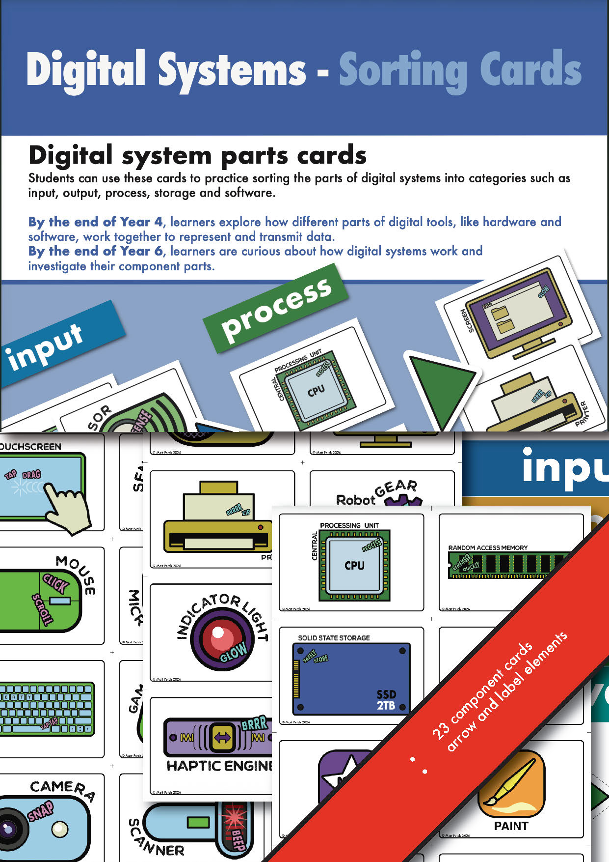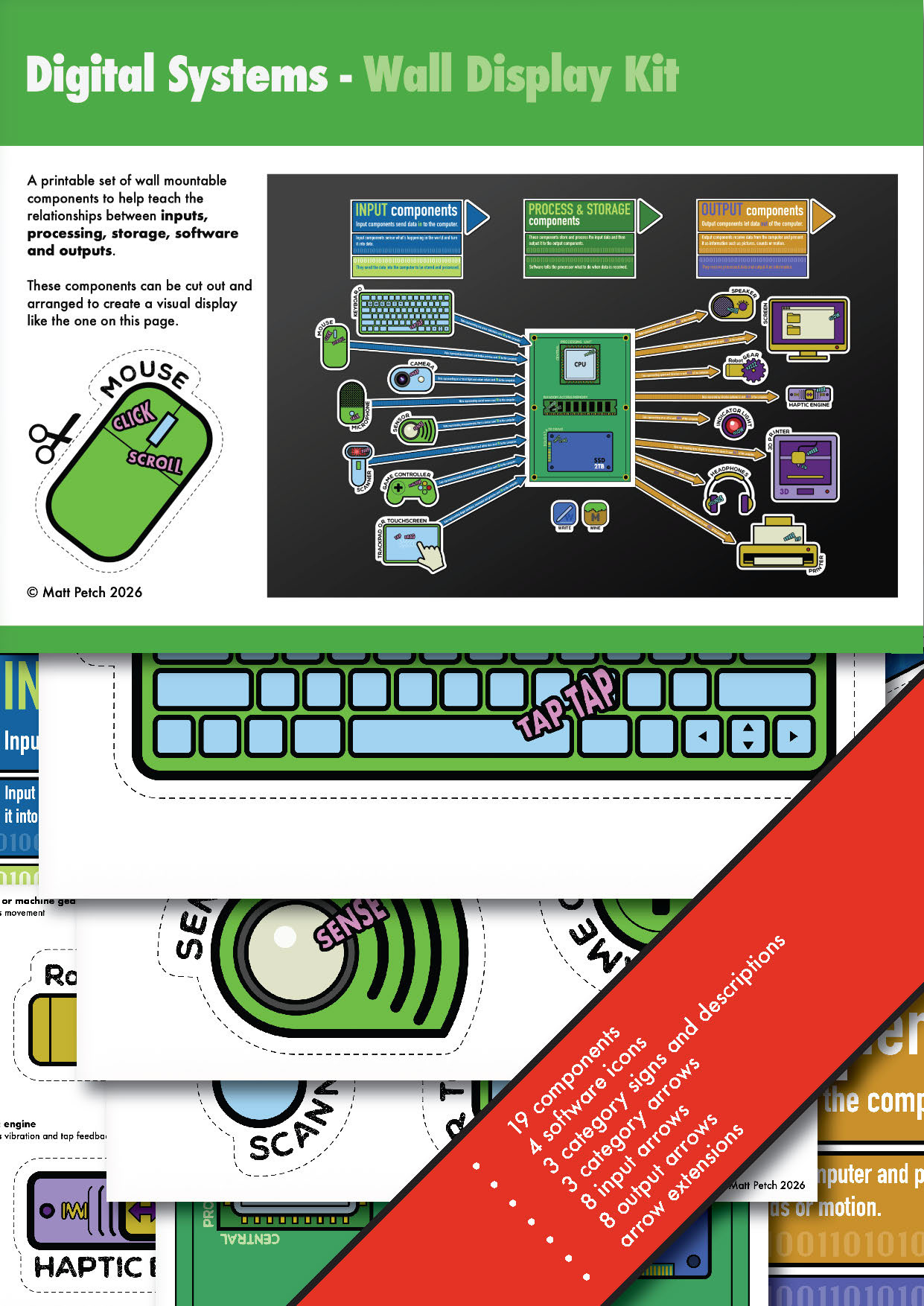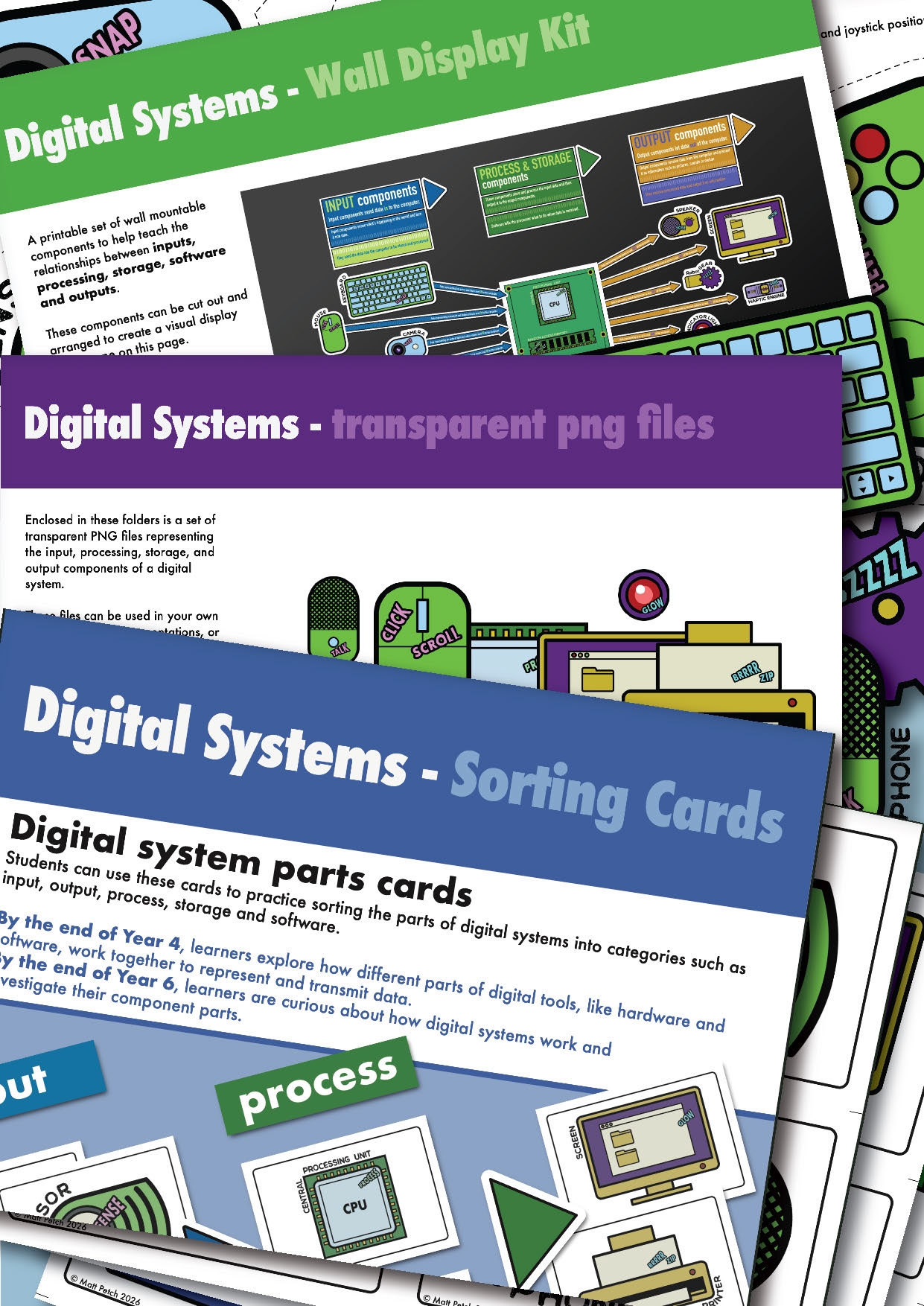 A set of pages designed to be printed, cut out, and assembled into an engaging classroom wall display. These visuals help students identify and understand the different components of a digital system in a clear and structured way.